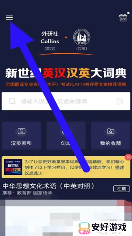 新世纪英汉大词典怎么使用(新世纪英汉汉英大词典如何设置学习提醒)教程:1、选择界面左上角【三条线图标】点击,跳转进入下一个界面
