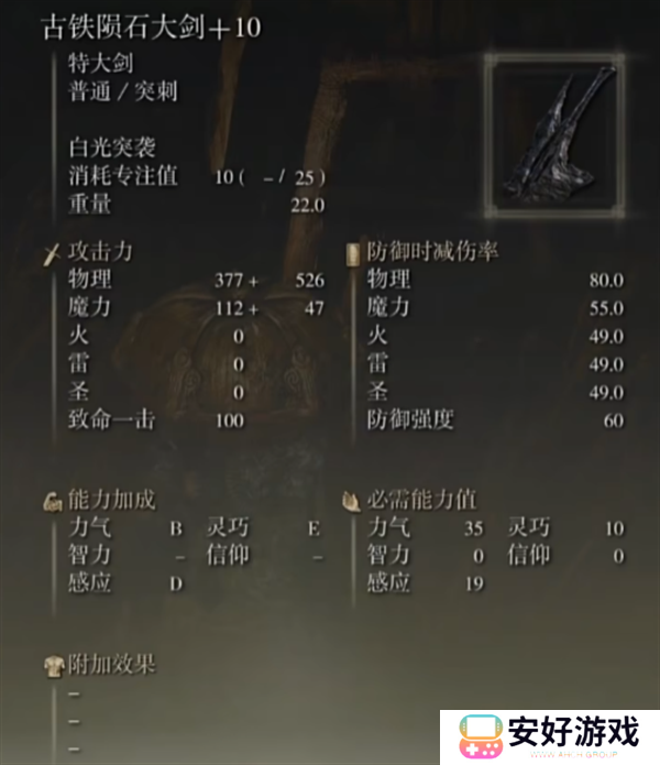 2、古铁陨石大剑的面板属性可以参考下图所示,不仅有着高额的攻击力加成,而且有物理魔力和致命一击,附带的战技针对人形BOSS有着极为出色的伤害能力。