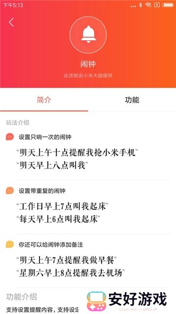 1、小爱音箱可以贴心的设置人工AI闹钟。让你不会睡过头,错过工作、学习等每一个重要信息。
