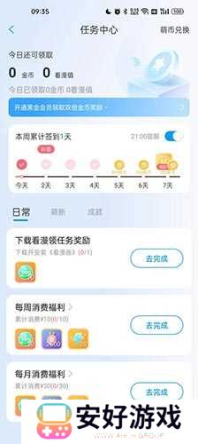 4、之后会来到任务中心页面,完成下列相应的任务可以获得萌币奖励。