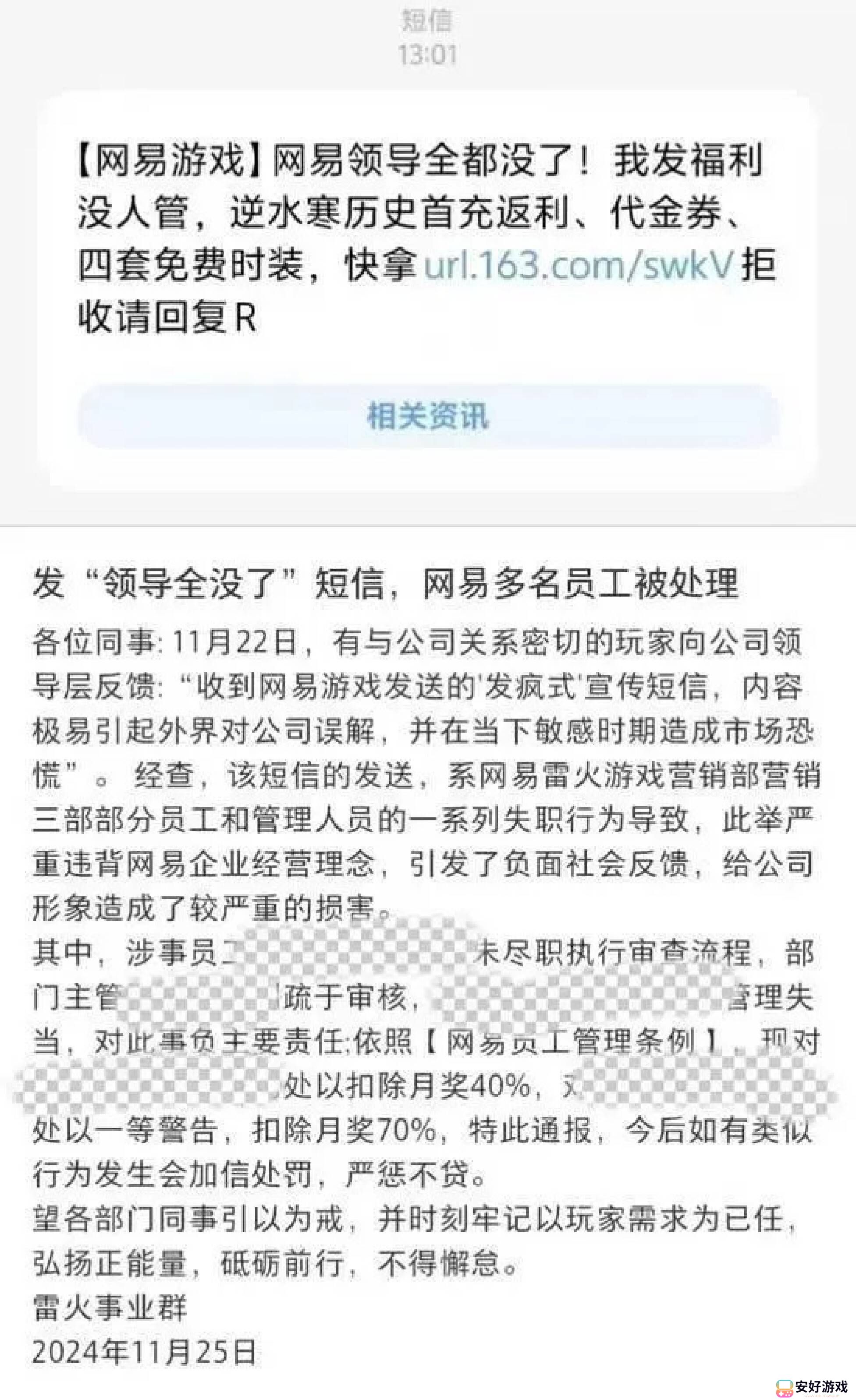 针对这一事件,网易雷火事业群迅速做出了回应。据通报,该短信的发送是营销三部部分员工和管理人员的一系列失职行为所致。网易雷火对此表示严厉谴责,并已经对涉事员工进行了扣钱和警告的处罚。通报中强调,此举严重违背了网易企业的经营理念和价值观,对公司形象造成了较严重的损害。