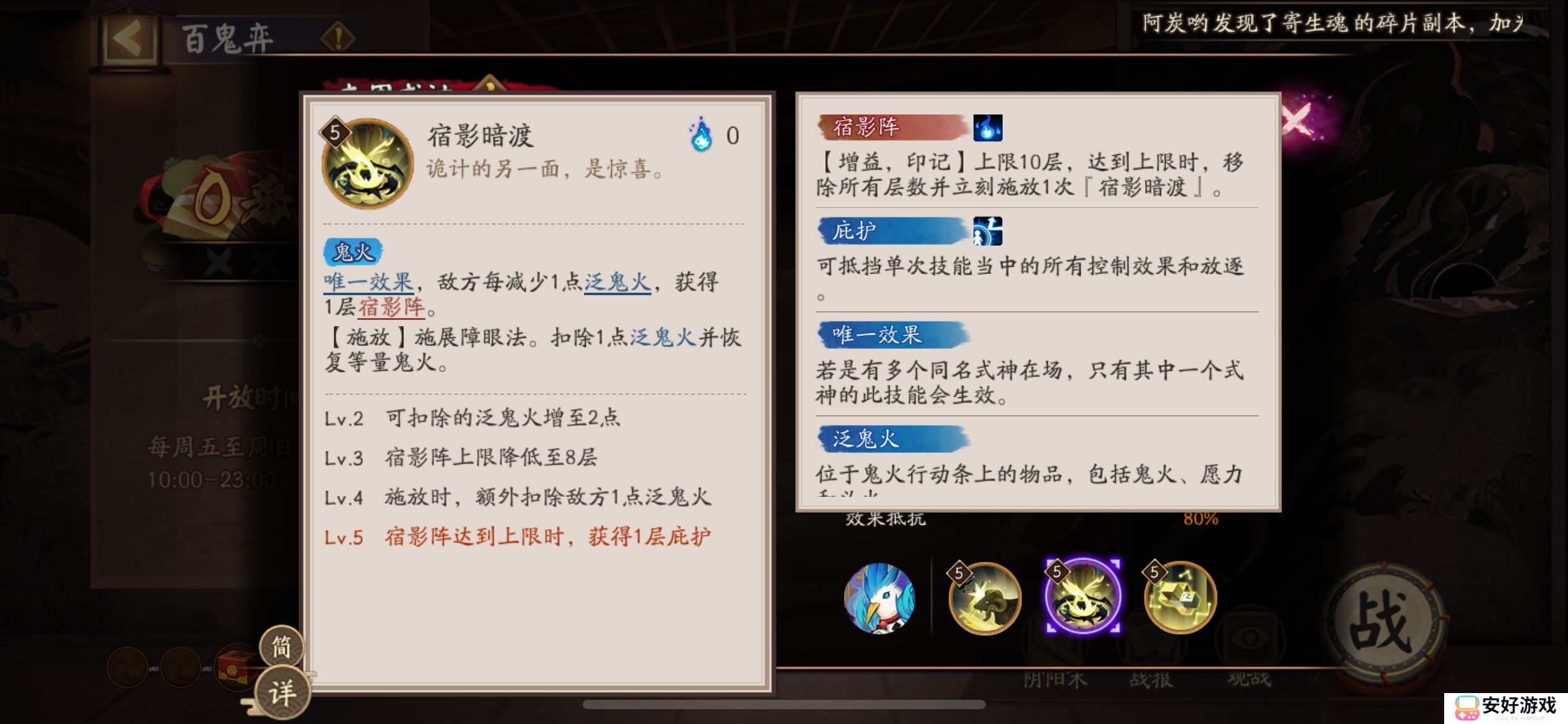 唯一效果,敌方每减少1点泛鬼火,获得1层宿影阵。