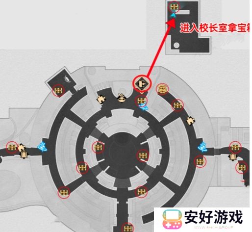 2、特殊宝箱:其中一个宝箱在校长室中,玩家可从格拉克斯雕像附近的锚点旁,通过蓝线进入。