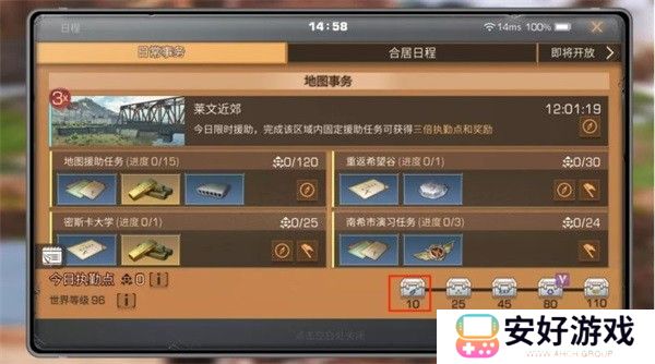 当幸存者采集等级达到7级会解锁日程完成日常事务会获得执勤点,累计执勤点将会解锁对应的日常宝箱,解锁即可获得大量熟练度奖励。