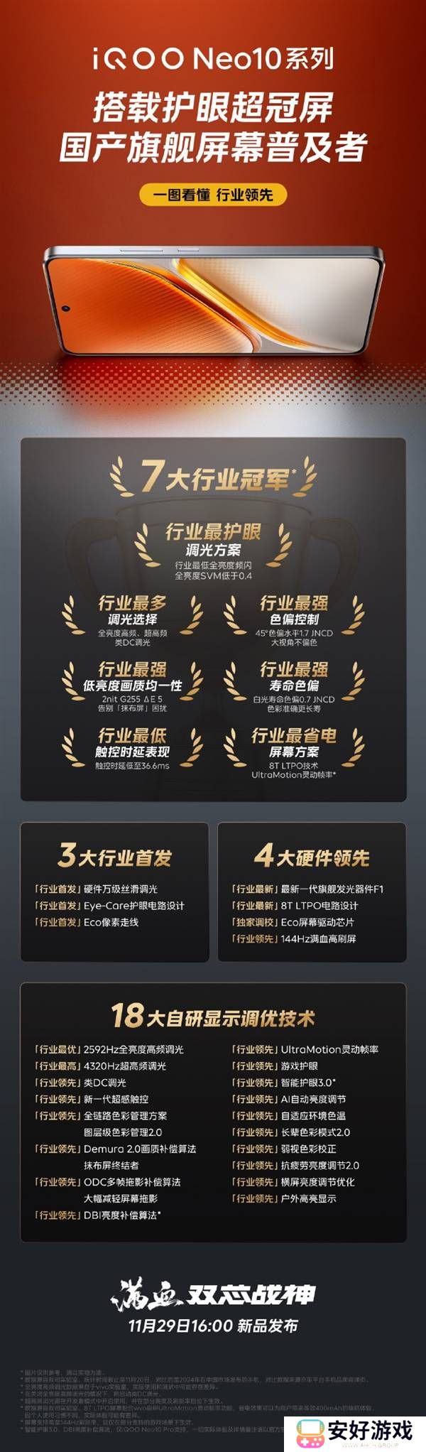在自研显示技术方面,iQOO Neo10系列展现了强大的实力,拥有18项领先技术,如2592Hz全亮度高频调光、4320Hz超高频调光、类DC调光、户外高亮显示、弱视色彩校正以及游戏护眼等。这些技术共同为用户带来更为舒适、护眼且高质量的视觉体验。