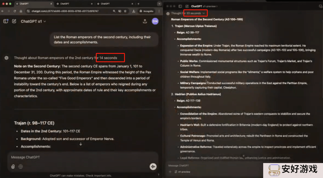 尽管在回答能力上提升有限,但o1正式版在用户体验方面却有了显著提升。其重大错误犯错率较预览版减少了约34%,回答速度也提高了约50%。在直播现场对比测试中,面对“列出二世纪的罗马皇帝,包括他们的时期和成就”这一问题,o1正式版仅用14秒便给出了回答,比预览版快了近20秒,这一差距让用户感受明显。