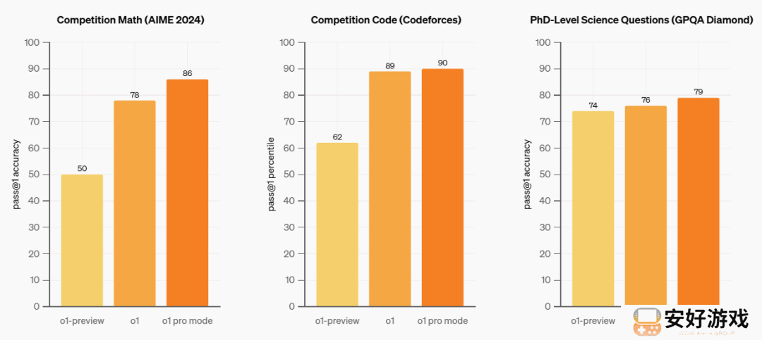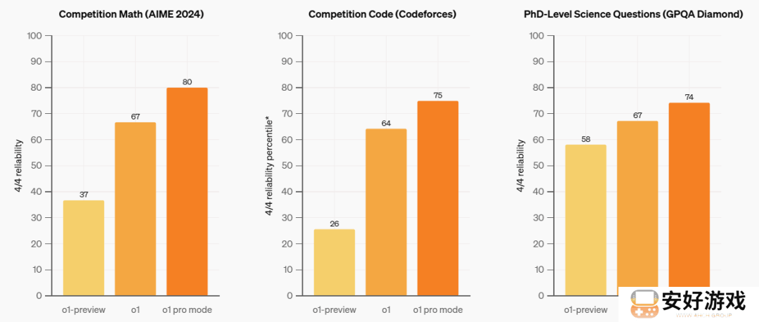 在回答的可靠性上,o1正式版也展现出了显著进步。通过“4/4可靠性”测试,o1正式版在各个领域都比预览版有了显著提升,而Pro版则更进一步。这一进步,无疑增强了用户对o1模型的信任度。