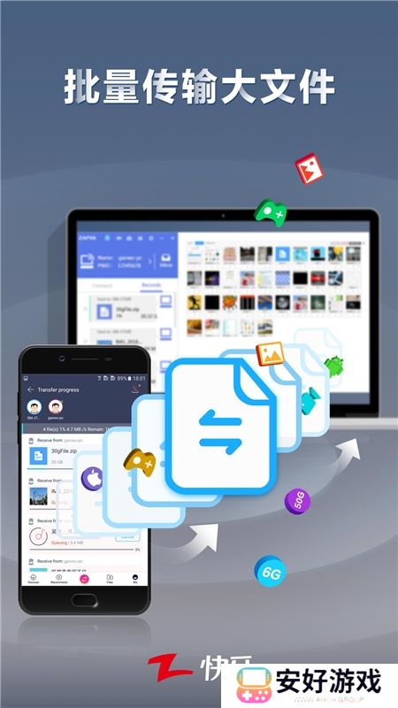 4.快牙App更有多种连接方式,传输便捷且零流量。处于同一局域网即可发现与传输,传输速度可达5M/秒,1分钟可传120张照片,更加人性化的设计是,一台传输设备开启热点,如果其他设备加入该热点,那么这些设备间,传输过程无需流量,即可完成时传输!有了这个功能,妈妈再也不用担心我以为没有流量,而无法传送或接受各类文件了!特别是使用苹果手机的小伙伴们,对于手机连接电脑设备的繁琐之痛,想必是深有体会,使用快牙App,让您轻松将苹果手机和电脑设备连接起来,图片发送,文件传送,通讯录备份等等操作再也不用头晕脑胀了!手机铃声,音乐下载也能轻松搞定!