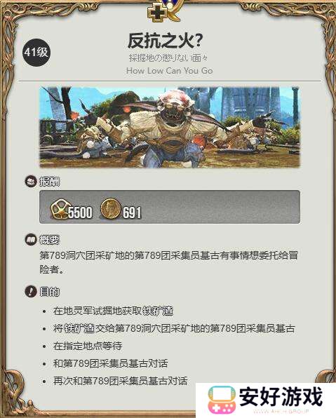 1、首先去拉诺西亚外地(21.4.18.0)找npc【第789团采集员基古】接任务【反抗之火?】;