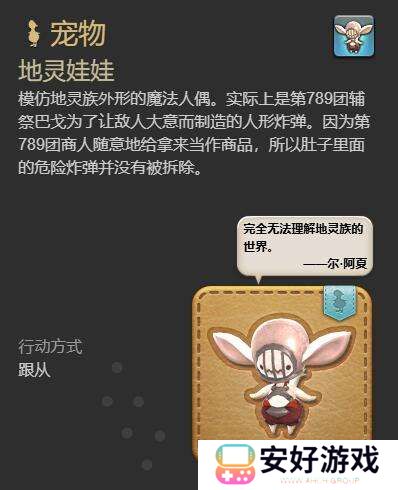 最终幻想14中有许多的宠物,很多玩家都想知道地灵娃娃怎么获得,玩家花费25000金币在【地灵杂用商人】处购买即可获得,接下来就由小编给大家带来了详细的《最终幻想14:水晶世界》地灵娃娃获得方法,希望这篇文章可以帮到大家!