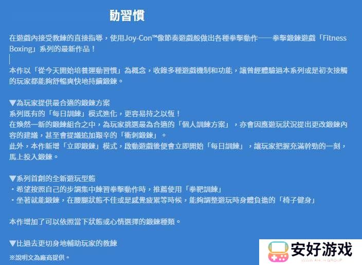 任天堂eShop近日迎来了一款备受期待的运动类游戏试玩版——《有氧拳击 3 -你的私人教练-》。该试玩版于11月21日正式上架,玩家将有机会免费体验4天,深入感受游戏的魅力。游戏全面支持中文字幕与中文配音,为中文玩家提供了极大的便利。