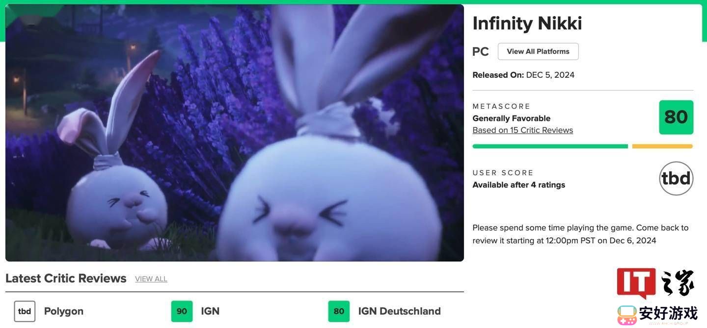 在游戏的评测方面,《无限暖暖》也取得了不俗的成绩。metacritic网站上,该游戏的PC版本已经获得了基于15家媒体评测的80分高分,而其他版本的分数也备受期待。IGN更是给予了本作9分的高分评价,称赞其换装系统尤为出色。