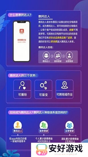 应用说明:惠民达人是京东惠民小站推出的社交电商项目,成为惠民达人,即可体验新的分销模式,让每个客户变成你的团队成员,躺赚不再是梦想。