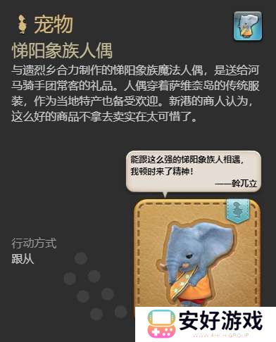 最终幻想14悌阳象族人偶是一只很可爱的小象,有玩家不知道悌阳象族人偶怎么获得呢?它是在萨维奈岛 X:20.4 , Y:28.4.找甘妲用8个星钴币兑换获得的。如果你喜欢这只小象,就可以把它带回家。接下来就由小编给大家带来了《最终幻想14:水晶世界》悌阳象族人偶获得方法!