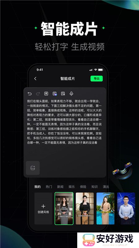 轻松打字,口播短视频即可制作完成。借助 AI 编写文案、爆款文案库,智能生成完整影片,高效构建矩阵内容。从此,告别繁琐拍摄、剪辑、录制流程。