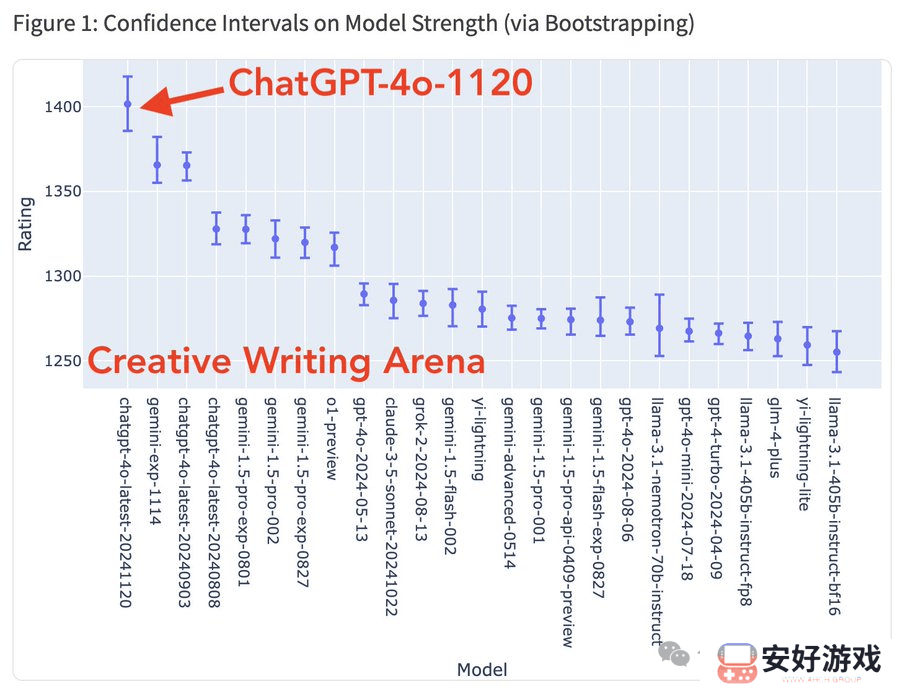 在大模型竞技场的创意写作分榜上,新版4o(ChatGPT-4o-1120)的得分从上一个版本的1365跃升至1402,进步显著。同时,在代码能力、数学能力、困难任务以及风格控制等多个方面,4o也均有所提升,成功从之前的第二名跃升至第一名。