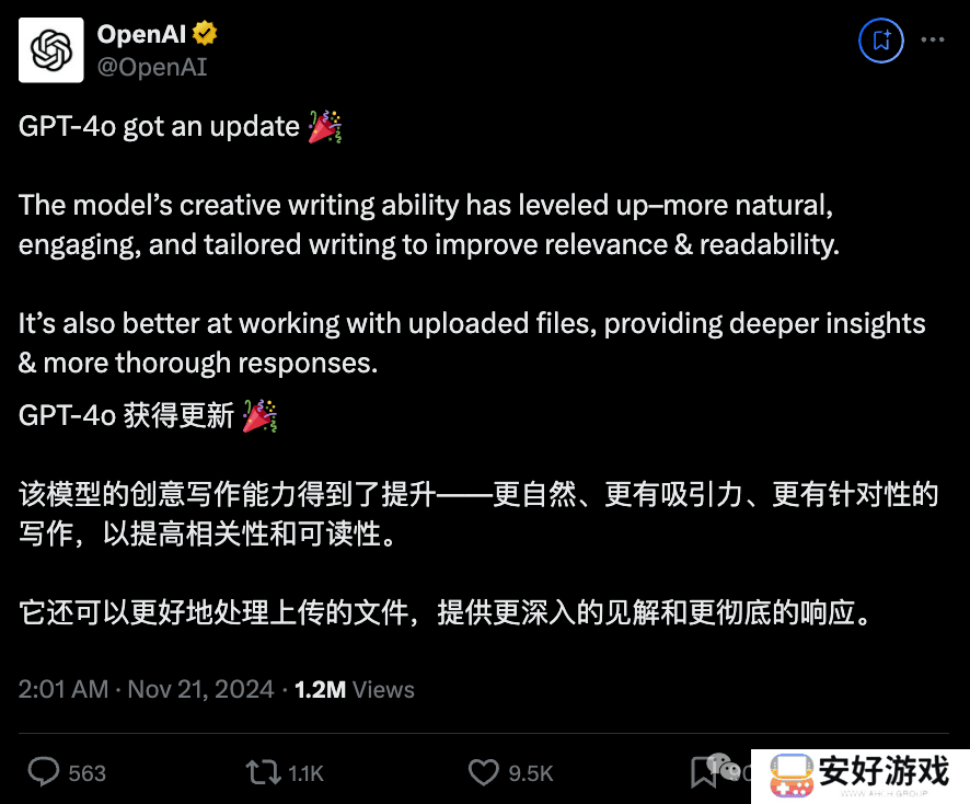 此次4o的更新重点在于“创意写作能力”,据官方介绍,新版本能够生成更加自然、吸引人且有针对性的文本,显著提升了文本的相关性和可读性。4o在处理上传文件方面也进行了优化,能够提供更深入的见解和更全面的回应。