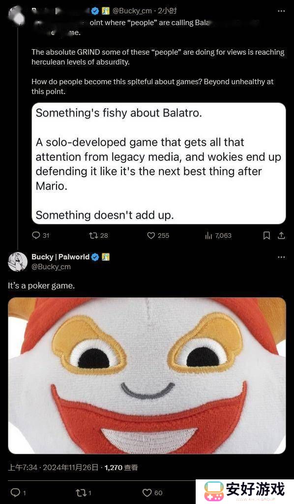 对此,《幻兽帕鲁》的社区经理Bucky表达了不同的看法。他认为,《小丑牌》的成功并非源于所谓的“觉醒”元素,而是其本身独特的魅力和玩法。他在社交媒体上反驳道:“一些人反复强调同一观点,已经到了荒谬的地步。人们为何会对一款游戏如此恶毒?这简直病态至极。”他强调,“这仅仅是一款扑克游戏。”