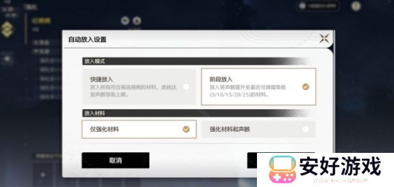 强化声骸时将可以自动【阶段放入】强化素材,强化至最近的可调谐等级(5/10/15/20/25)。