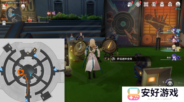 2、完成三处梦境迷钟解谜后,跟随指引来到中央靠西侧草坪处