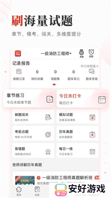每日一练、章节练习、模拟考场、历年真题在线题库,配备老师视频解析掌上刷,另有做题记录、错题集、收藏试题、积分下载试题离线刷,以及个性化做题习惯设置,移动学习更方便!