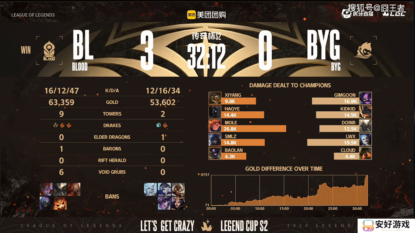 进入关键的第三局,BL依然保持着高昂的斗志和出色的状态。他们凭借鳄鱼、千珏等英雄的强势表现,从比赛一开始就牢牢掌控着比赛的节奏。BYG虽然试图通过多次团战来挽回劣势,但面对BL的铜墙铁壁,他们的努力显得徒劳无功。最终,在32分12秒时,BL再次团灭BYG,以三局全胜的战绩零封了对手,成功挺进胜者组决赛。