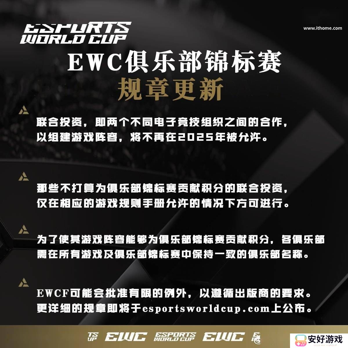 在电子竞技领域,一项重大变革正悄然酝酿。EWC电竞世界杯官方近期对俱乐部锦标赛的相关规定进行了修订,明确禁止了2025年起不同电竞组织间的联合投资行为,旨在构建更加公平的竞技环境。具体而言,任何旨在组建游戏阵容的联合投资将不再被允许,除非该行为符合相应游戏规则手册的特定条款,且不影响俱乐部锦标赛的积分体系。
