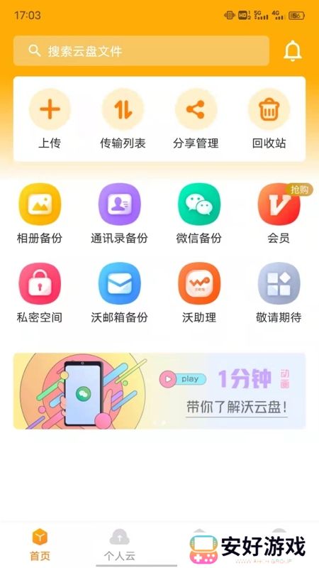 联通云盘app官方客户端是中国联通官方推出的一款手机云存储app,依靠中国联通的高带宽能力,保障用户上传/下载不限速,支持本地相册备份、通讯录备份、微信备份、沃邮箱备份功能,一建存储到云端,释放你的手机空间。