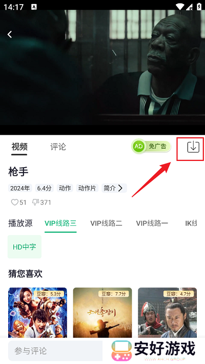 2、进入APP主界面后,挑选一部自己喜欢的视频,这里我以《枪手》这部电影举例,点击进去后,在视频右下角有一个下载图标,点击即可缓存视频到手机。