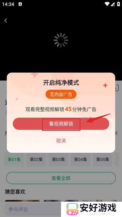 3、弹出开启纯净模式窗口,这里我们直接点击看视频解锁按钮即可。