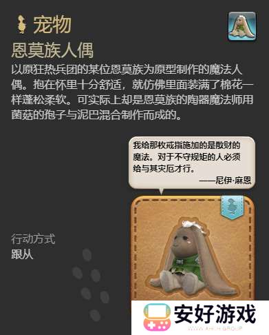 最终幻想14恩莫族人偶看起来像一只兔子,耳朵特别长。那么恩莫族人偶宠物怎么获得呢?大家可以去水晶都和游末邦,找赛栎和伊尔弗洛伊兑换获得,接下来就由小编给大家带来了详细的《最终幻想14:水晶世界》恩莫族人偶宠物获得方法!