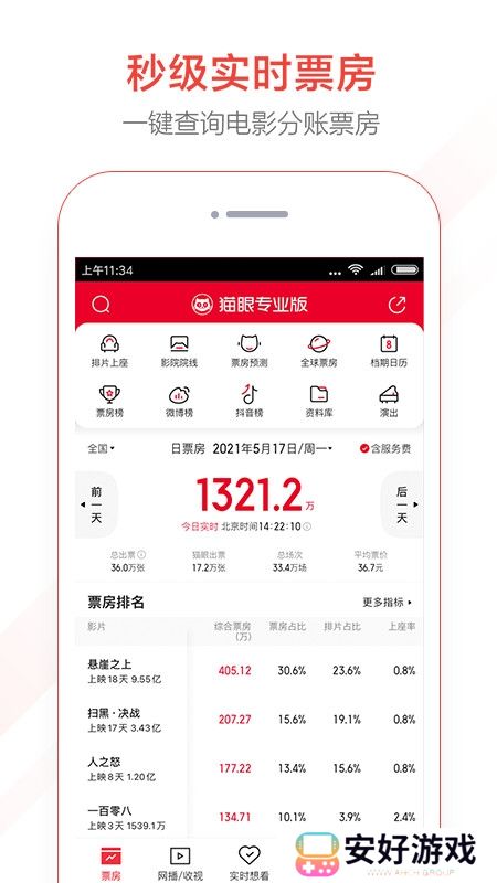 由猫眼电影出品,为电影行业从业者提供及时、准确、专业的电影票房数据分析(秒级实时票房,排片,影院经营数据等,