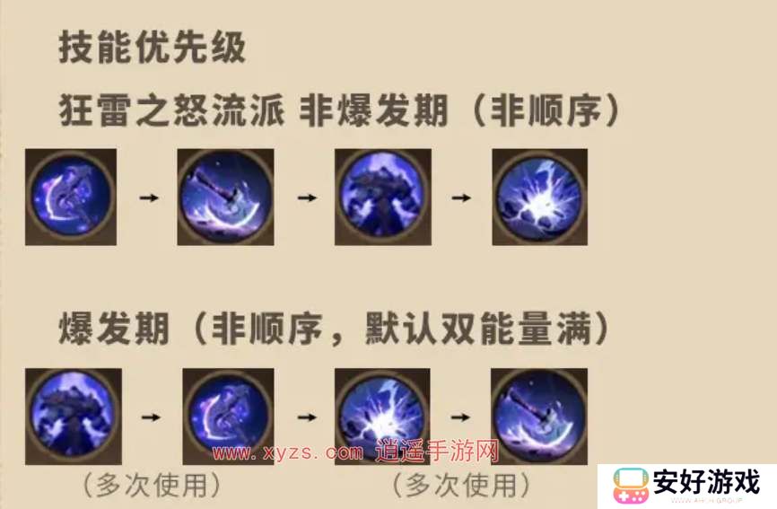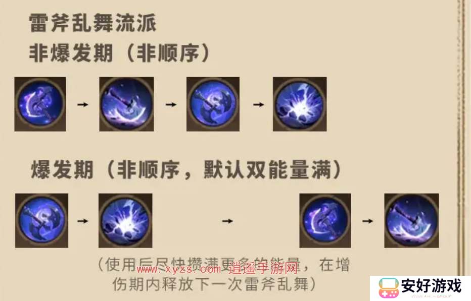 3、雷岸乱舞流派能量越高技能伤害越高,且释放技能后有一段时间增伤效果,需要快速积累能量,在增伤效果期间尽可能多的打出输出。