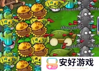4、然后将左侧的阳光向日葵铲除并补充寒冰仙人掌,在右侧补充一列钢刺坚果王。