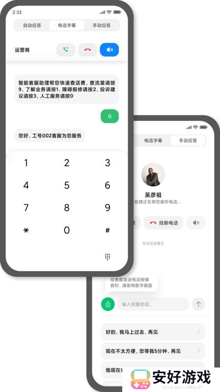 当不方便接取电话时,使用小爱同学的“AI通话”(电话助理)功能,可以接起电话并将对方的话用文字显示在屏幕上,小爱同学会根据对方说的话,自动生成几条最合适的回答,您可以选择其中一句回答,小爱将用语音的方式说给对方。