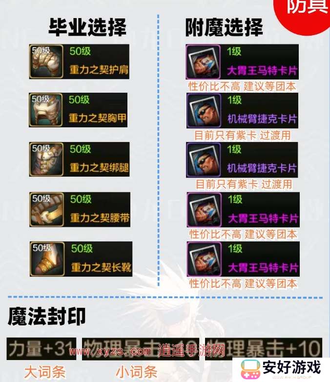 2、防具推荐:重力之契套装,附魔卡片可以参考下图所示,但性价比不高部分只能作为过渡,建议等后续团本开放后再打造。
