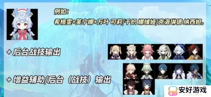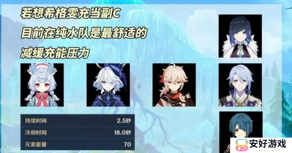 2、如果将希格雯作为副C的话,主要依赖大招打伤害,但需要其他输出来补足空窗期,推荐走纯水体系阵容。