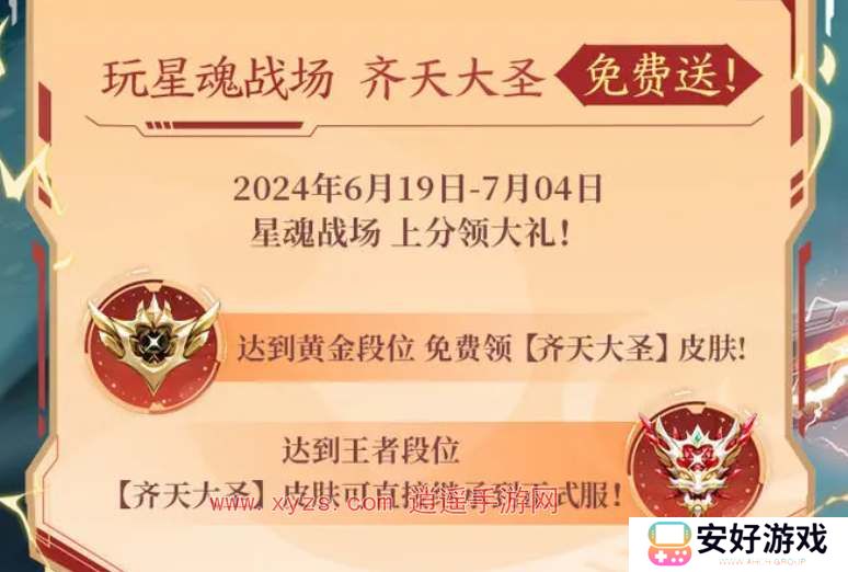 1、孙悟空齐天大圣皮肤在内测阶段可以通过参与活动来免费获取:在6月19日至7月4日期间体验【星魂站场】玩法,提升段位达到黄金即可免费领取皮肤。