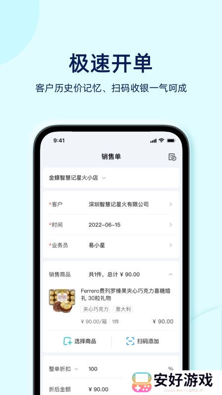 2.移动快速开单:随时随地扫码、查价、开单、收银 ,一气呵成。无论在店内,还是外出谈业务,都可以随时开单。
