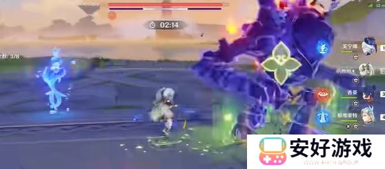 2、先使用草神给敌人挂上草印记,切香菱释放锅巴,芙宁娜开e接重击切换芒性。