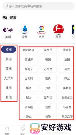 5、点开数据,有欧洲、美洲、亚洲、大洋洲、非洲等各种地区的赛事直播内容。