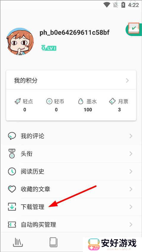 6、文章下载后可打开个人中心页面,用户可查看阅读历史、收藏文章等,点击下载管理;