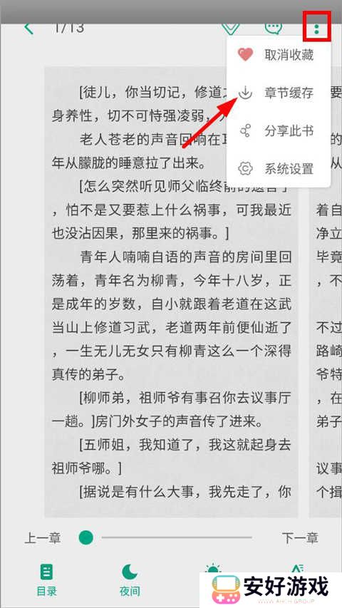 5、也可进入正文页面,单击屏幕,点击右上角“...”,下拉选择章节缓存;