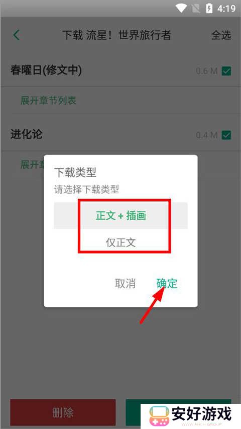 4、选择下载类型(正文+插画、伪正文),点击确定;