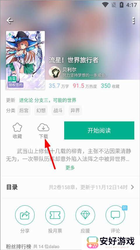 2、进入小说主页面,用户可收藏、阅读、分享、评论小说,点击阅读键旁边的下载按钮;