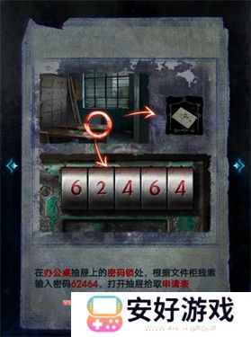 8、点击办公桌的抽屉,监视密码锁,输入文件柜的线索密码62464,就可以打开抽屉拾取申请表了。