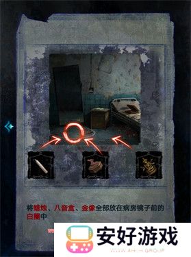 25、接着返回病房,将蜡烛、八音盒、金佛像放入镜子前的白圈中,就可以通过第一章了。