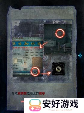 1、首先玩家需要在病院前台处查看宣传板,拾取边沿上的胶布。