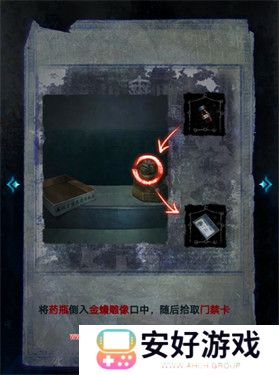 4、将药瓶的药倒入前台金蝉雕像的口中,获取门禁卡。