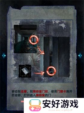 5、接着来到走廊,用门禁卡挑开接待室的防盗链,进入接待室中。